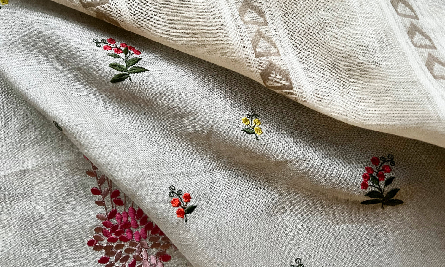EvertonA combination of embroidery styles and stitches on a light linen base create the whimsical motifs of Everton. Its cheery sprigs are enlivened by a nuanced colour palette.-