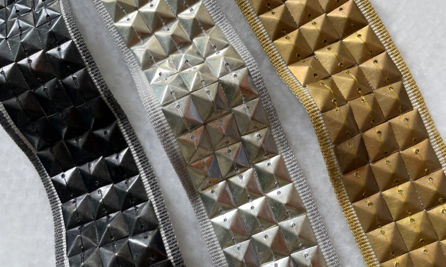 ConcordPrecise rows of pyramids reflect in Concord, a chic design in a matte metallic finish. Available in silver, gold, and pewter, Concord's low burnish has an irresistible allure and a stately, polished edge.-