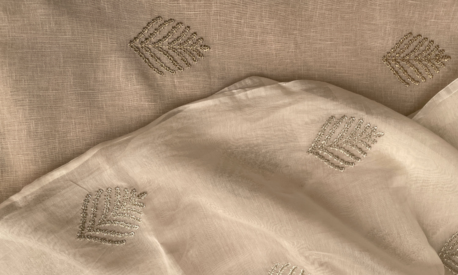 In Ridaa Zar, fine leaves taper to lustrous points, their sheen accentuating the form on a sheer silk-blend base, as if suspended in light.-