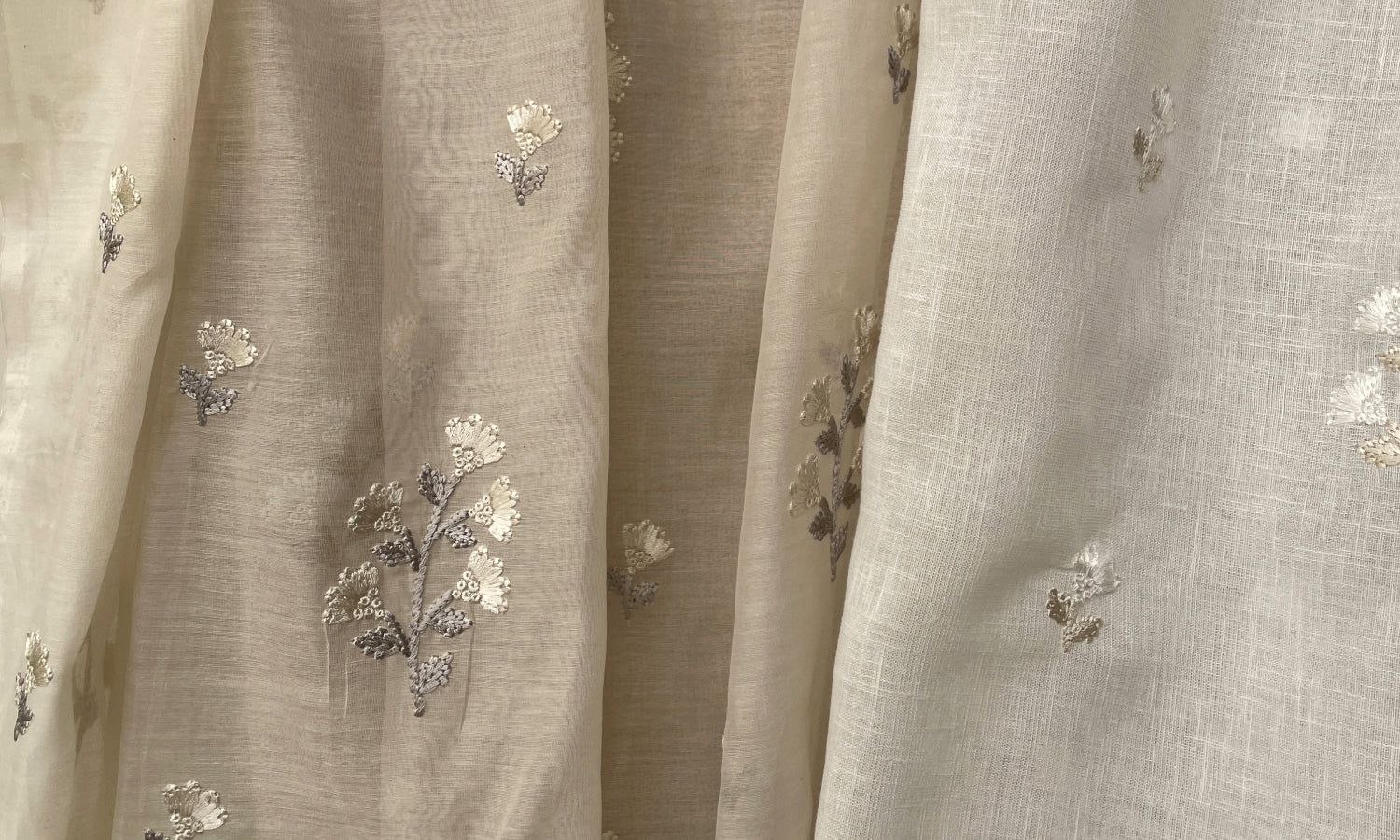 In Aurea, fan-shaped flowers and tapered leaves in textured stitches drift around a flourishing stem on a sheer base.-