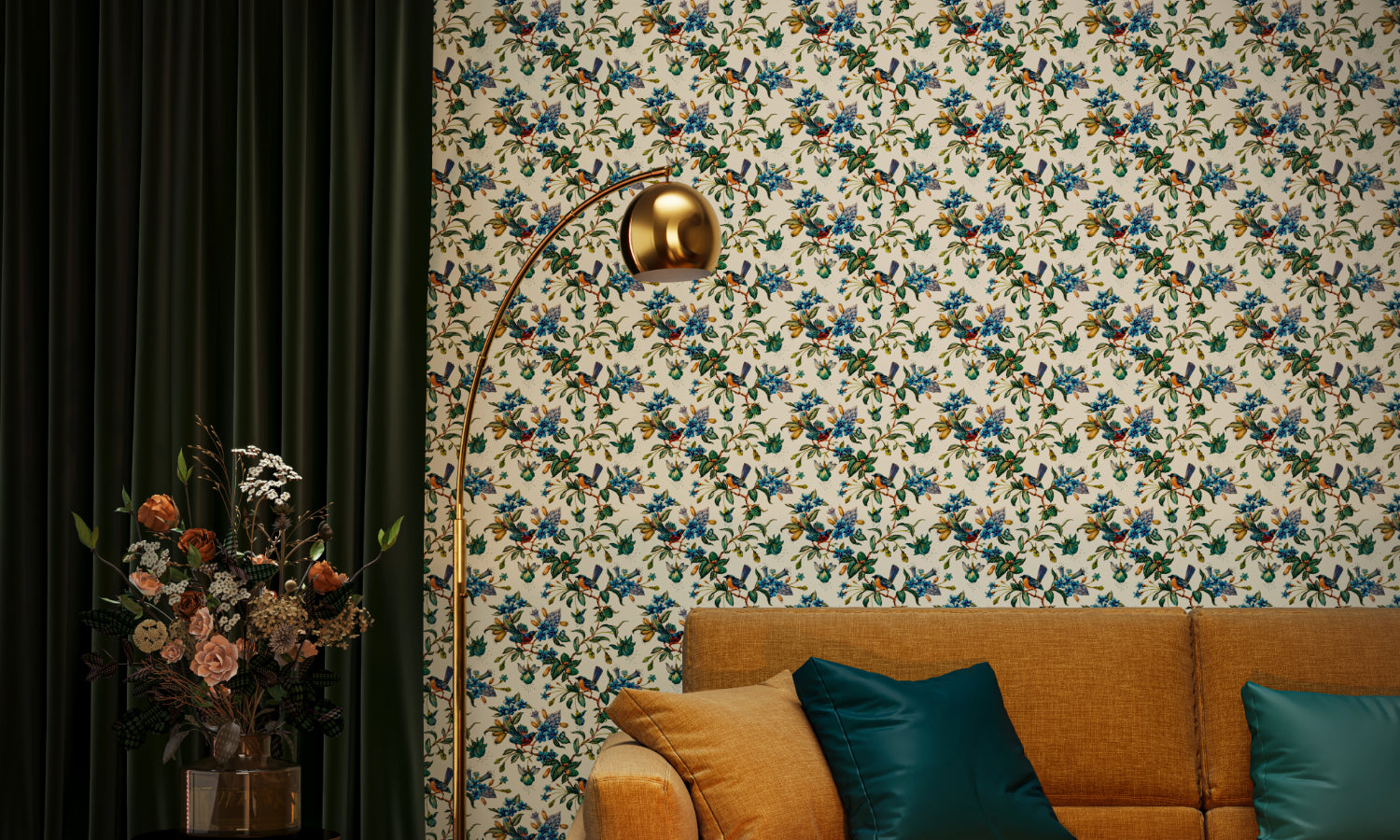 Saar is a detailed, nature-inspired pattern featuring delicate songbirds perched on flowering and leafy branches.-