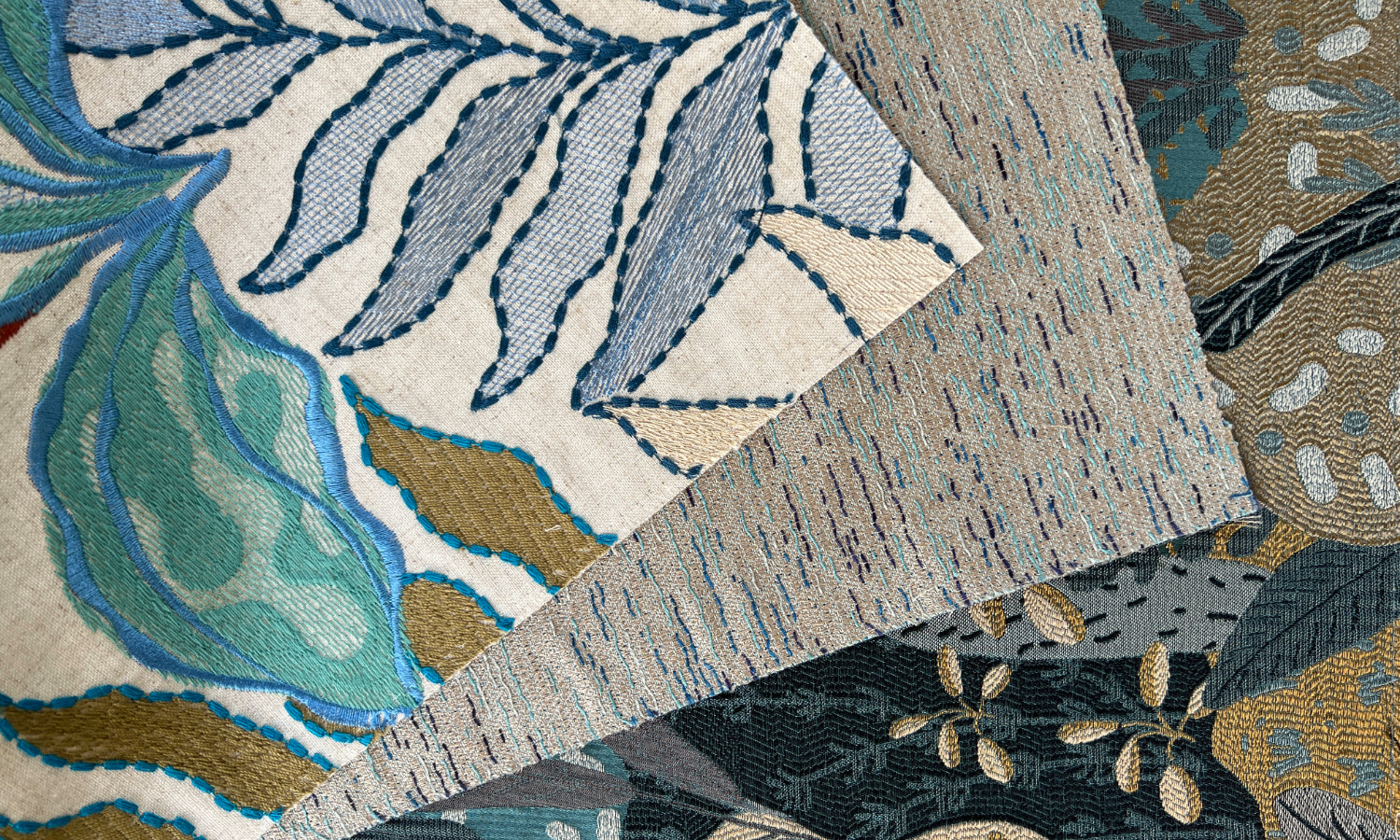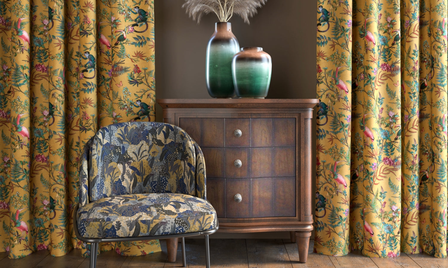 A flurry of peacock feathers covers Sunderban, a charming, exquisite fabric. Matte and subtle gloss play off each other to create a fabric brimming with texture, bringing a lively warmth to the pattern.-
