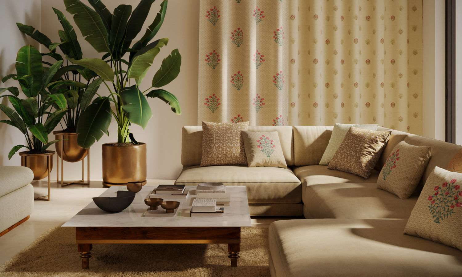 RangoonRangoon, inspired by an ancient brocade, features ornamental vines and floral patterns with dotted details, creating a cohesive and vibrant flow.-