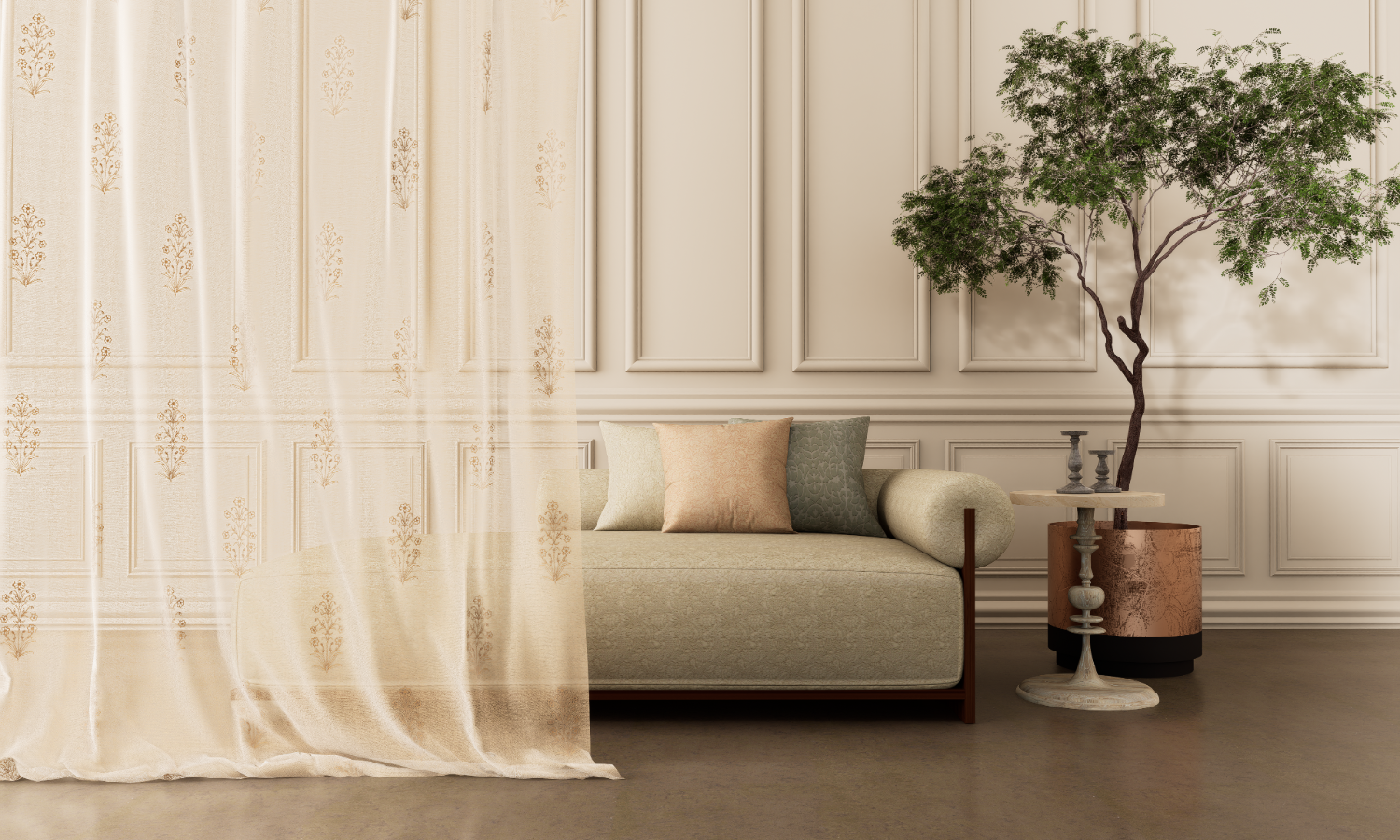CuddaloreCuddalore is a refined voile that echoes Porbandar’s botanical elegance in a softer, airier touch. Its vertical floral sprigs form gentle symmetrical clusters offering light, structured beauty.-